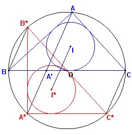 En el caso del triángulo rectángulo, tendremos además que OA y OA* son medianas y que OG:OA = OG*:OA* = 1/3. Por tanto GG*:AA* = 1:3. Teniendo en cuenta que el triángulo A*B*C* es el simétrico de ABC respecto de la mediatriz de AA*, el incentro I* de A*B*C* es el simétrico del incentro I de ABC y así la recta II* es paralela a AA* y AA', y esto es cierto para cualquier triángulo ABC, sin necesidad de que ABC sea rectángulo. |