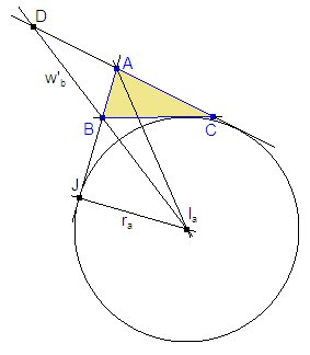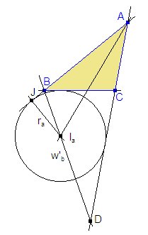 Supongamos el problema resuelto. En las figuras 1 y 2 vemos cómo la bisectriz interior de ángulo A y la bisectriz exterior del ángulo B se cortan en el excentro Ia. También hemos situado los puntos J, proyección ortogonal de Ia sobre AB y D, intersección de la bisectriz exterior de B con la recta AC.