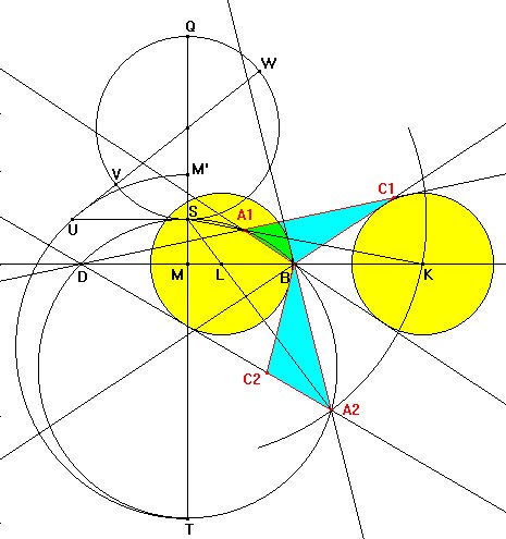 Ahora trazando un arco con centro S y radio UW cortamos en K a la recta DB y la recta SK corta a la circunferencia ST en A1, siendo A1K=AIa la tangente exterior del ángulo A1 del triángulo A1DB.