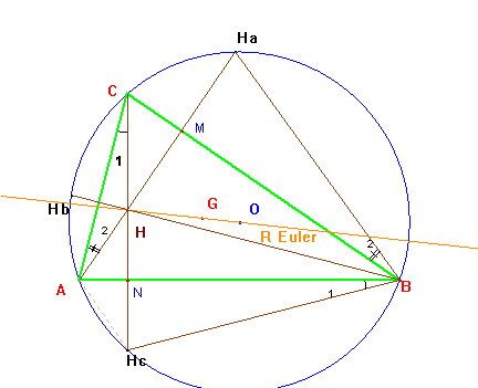 Si llamamos Ha a la proyección del ortocentro H desde A sobre la c. circunscrita se verifica que el ángulo HaBHc es el doble del ángulo CBA. Basta observar en la figura adjunta cómo el ángulo en B es la suma de los ángulos etiquetados como 1 y 2: tienen como suplementario el mismo ángulo HaHHc.