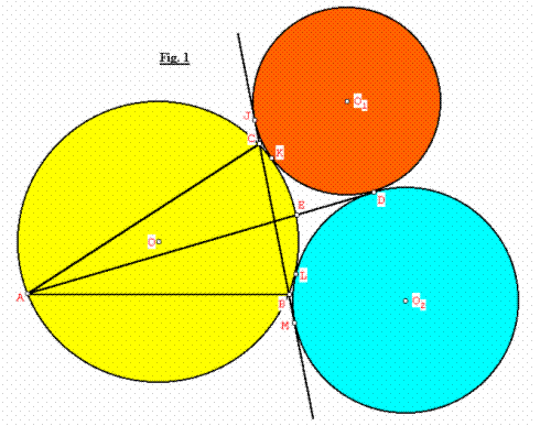 Se cumple que JK y ML concurren en el punto E (punto de corte de AD con (O)), debido a que: CK/CJ=BJ/BK=SQRT(R+r1)/ SQRT (R+r2)