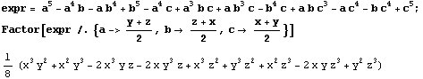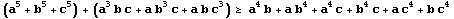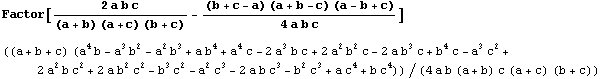 si El teorema de Muirhead dice que un símbolo mayora a otro si y solo si la desigualdad correspondiente se cumple para todos los valores positivos de las variables y que la iguadad se cumple si y solo si las variables son todas iguales. En nuestro caso se cumpliría que y esta desigualdad nos es desfavorable. Si fuera [5, 0, 0] >= [3, 1, 1] >= [4, 1, 0] sí podriamos razonar fácilmente que [5,0,0] + [3,1,1] >= [4,1,0] + [4, 1, 0] = 2 [4, 1, 0]. Un método apuntado en [2] es tener en cuenta que a, b, c son los lados de un triángulo, por lo que las cantidades x=b+c-a, y=c+a-b, z=a+b-c son positivas y podemos expresar la desigualdad en términos de ellas. En este caso la transformación require bastante cálculo, pero para eso tenemos a Mathematica: La expresión del paréntesis puede expresarse en la forma [3,2,0] - [3,1,1], y como [3,2,0] mayora a [3, 1,1] concluimos la que desigualdad es cierta. Por tanto: El área obtenida en f) es siempre mayor o igual que la obtenida en e). |