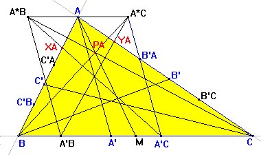 En la figura vemos la construcción correspondiente a la ceviana AA'. Como es habitual, el color azul representa los puntos que se consideran libres, en negro los que se obtienen a partir de ellos, destacándose en rojo los puntos finales de la construcción.