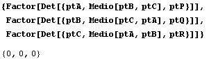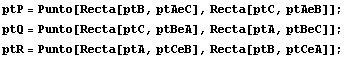 a) Ahora comprobamos que P, Q, R están en las medianas correspondientes a los vértices, A, B y C. Para ello, hallamos en cada caso el determinante formado por uno de los puntos P, Q, R y los extremos de la mediana correspondiente. Al anularse el determinante, los puntos están alineados.