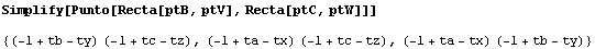 Vemos en efecto que las tres rectas se cortan en puntos del infinito (sus coordenadas suman 0), así que son paralelas. El centro de homotecia es