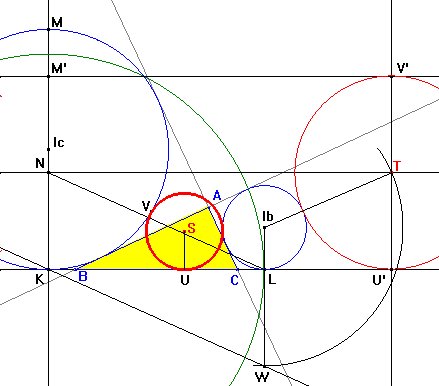 El centro de esta última circunferencia estará en la paralela media a las dos paralelas (en la figura la que pasa por el punto N) y este centro distará de Ib una distancia rb + NK. Prolonguemos el segmento IbL hasta W de manera que LW = NK (para ello basta unir LN y trazar una paralela por K). Con centro Ib y radio IbW trazamos un arco que corta a la parela por N en T. La perpendicular a BC por T determina los puntos U' y V', inversos de los puntos de contacto de la circunferencia buscada con BC e Ic.