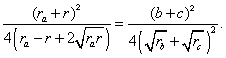 En el triángulo ABC (ÐA=90º), construir el círculo (O1, r1) tangente externamente a los excírculos (Ib) e (Ic) de tal forma que sea también tangente al lado BC, con el punto de tangencia entre B y C. Probar que: Donde: ra= radio del excirculo (Ia) y r = inradio de ABC. |
