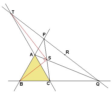 Sea el triángulo equilátero ABC, por el punto R simétrico de B con respecto a AC se traza una recta que corta a las prolongaciones de BA y BC en P y Q respectivamente. Además si S es el punto de corte de AQ y PC, y T es el punto de corte de AC y PQ. Demostrar que: SB = SA + SC y ÐBST = 90º. |