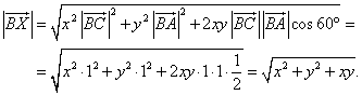 No perdemos generalidad si consideramos que el triángulo ABC tiene de lado 1. Entonces, el módulo del este vector BX será