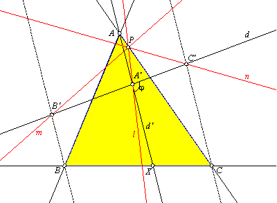 Sean, en un mismo plano, un triángulo ABC y una recta arbitraria d. Y sea j un ángulo tal que 0£j£p. Sobre d tomamos tres puntos A', B', C' de manera que cada recta AA', BB', CC' forme con d un ángulo j. Sean l, m, n tres rectas por A', B', C' respectivamente; de tal modo que el ángulo entre l y BC sea -j igual al que forman m con CA y n con AB. Demostrar que l, m, n son concurrentes. |