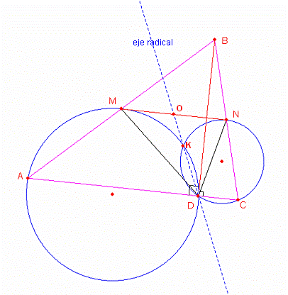 Determinamos que el segmento MN es tangente a las dos circunferencias luego la recta que pasa por los puntos D y K es el eje radical por lo tanto por definición de eje radical se cumple que OM=ON