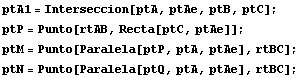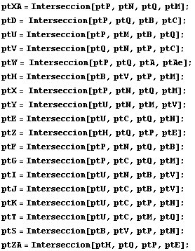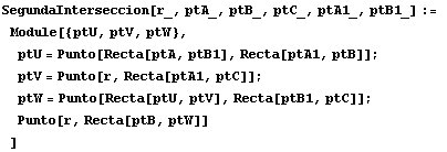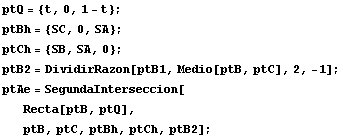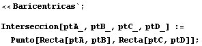 Para hacer cálculos con Mathematica con lo que hemos dicho hasta aquí invocamos al cuaderno Baricentricas.nb y definimos una función para hallar el punto de intersección de dos rectas AB y CD: