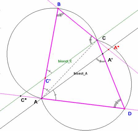 Si las bisectrices de esos ángulos son paralelas, son semejantes los triángulos BCC’ y DA’A o bien BA”A y DCC”. En cualquier caso son iguales los ángulos en B y en D. Tomando D sobre el arco capaz de AC y amplitud el ángulo en B tenemos resuelto el problema.