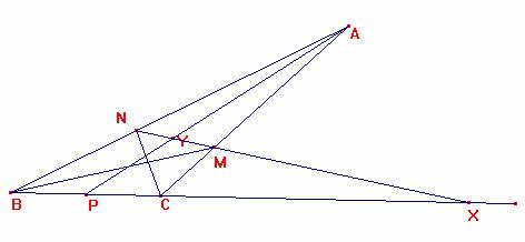 Consideremos ahora el triángulo APB, siendo el P el punto medio de BC, y apliquemos el teorema de Menealo con los puntos X, M y Y, siendo el Y el punto de corte de la recta AB con MN. Se tiene: