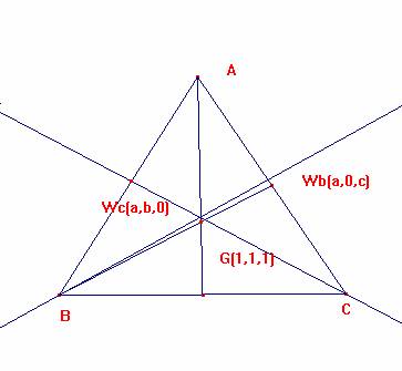 La recta que passa pels peus de les bisectrius interiors dels angles B i C passa pel baricentre del triangle.