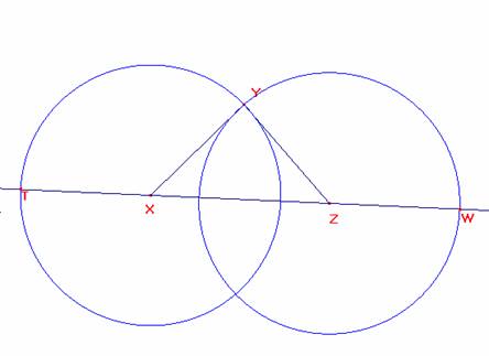 Con centros en X y Z trazamos las circunferencias de radios XY y ZY que cortarán a la recta XZ en los puntos T y W. TW es el perímetro de XYZ y los triángulos TXY y WZY son isósceles con sus ángulos la mitad de los de X y Z.