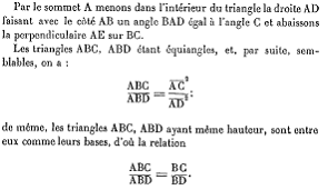 Por el vértice A llevemos en el interior del triángulo la recta AD haciendo con el lado AB un ángulo BAD igual al ángulo C y abatamos la perpendicular AE sobre BC. Los triángulos ABC y ABD son equiángulos y por tanto semejantes, por lo que se tiene que [ABC]/[ABD]=AC2/AD2 Además, al tener la misma altura, la relación de áreas es igual a las de las bases, de donde se tiene la relación [ABC]/[ABD]=BC/BD |