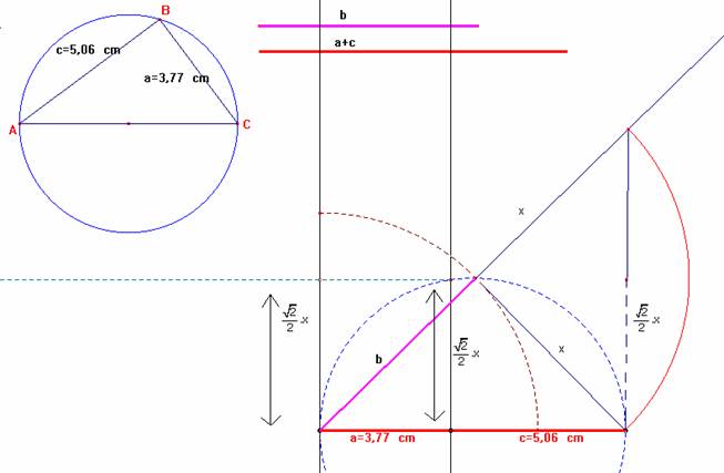 En el triángulo rectángulo ABC a construir tenemos que son conocidas la hipotenusa b y la suma de los catetos a+c. De la relación pitagórica (a+c)2 − b2 = 2∙a∙c, podemos construir el segmento x de modo que x2=2∙a∙c y así el segmento de medida