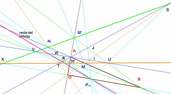 V= M’N∩BN’ y Pinf= OB∩MM’.