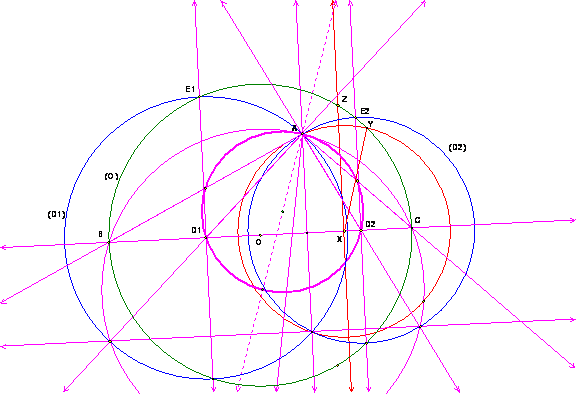 Así esta circunferencia homotética (la púrpura en el esquema) pasará por tantopor los puntos medios de los lados AB y CA e intersecará a BC en los puntos requeridos D1 y D2