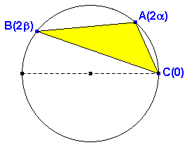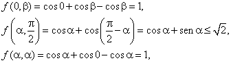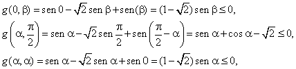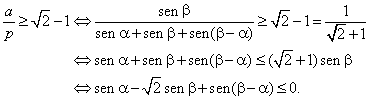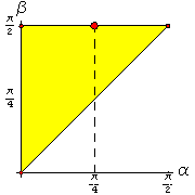 es evidente que f no tiene extremos en el conjunto abierto abierto 0 < a < b < p/2, coloreado en amarillo en la figura y correspondiente a los casos en que ABC es obtusángulo. Entonces, los extremos de la función f en el conjunto cerrado 0 £ a £ b £ p/2 estarán en la frontera, y evaluando la función f en dichos puntos obtenemos, teniendo en cuenta el Lema 2, por lo que, aplicando el Lema 1, queda demostrada la primera desigualdad propuesta, cumpliéndose la igualdad para a = p/4 y b = p/2. |