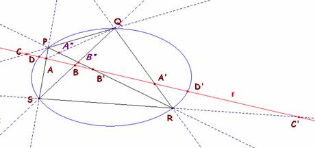pares de lados opuestos de un cuadrivértice PQRS son cortados por cualquier línea r que no