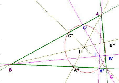 Consideremos la proyectividad entre el lado AB y el lado AC definida haciendo corresponder a la terna (B, C’, C”) de AB la terna
