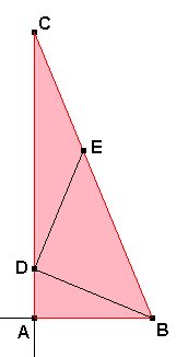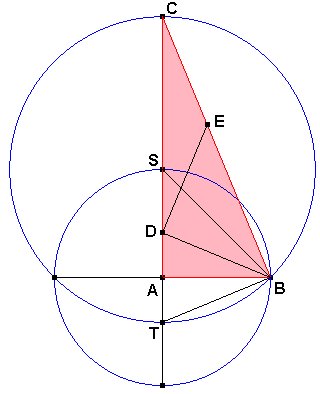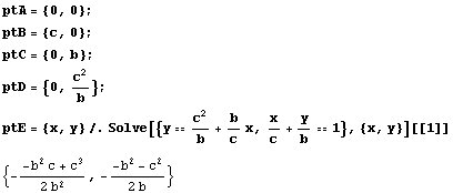 Entonces AD : AB = AB : AC de donde AD = c^2/b. Así tenemos D=(0, c^2/b). Siendo DE perpendicular a DB, el triángulo ECD será siempre isósceles, siendo la segunda coordenada de E : (1/2)(b + c^2/b). La primera la podemos hallar teniendo en cuenta que la ecuación de la recta BC es x/c + y/b = 1. También podemos hacer: