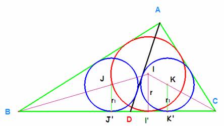 Los incentros junto con los puntos de contacto con la base y los vértices B y C forman triángulos rectángulos. Son semejantes BJ’J y BI’I de una parte y CK’K y CI’I de otra.