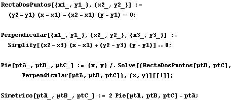 En este caso no vemos una solución tan rápida como en el anterior y recurrimos a la geometría analítica. Para ello nos preparamos con unas cuantas funciones de Mathematica que nos simplifiquen los cálculos: