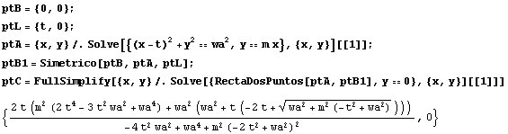 El pie L de la bisectriz del ángulo A sobre la recta BC será un punto a determinar, con coordenadas (t, 0). El vértice A estará localizado sobre la recta y = mx, a una distancia wa de L.
