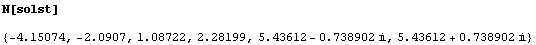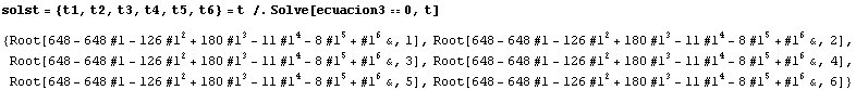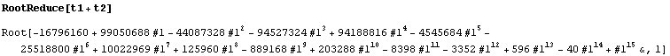 Aquí RootReduce da el polinomio mínimo para el número algebraico t1+t2. Este polonomio coincide con la resultante de grado 15 que aparece en el documento de Titus Piezas III. Podemos ver que se trata de un polinomio de grado 15, por lo que nuestra ecuación de grado seis no es soluble por radicales. Si el resultado hubiera sido de grado menor, entonces el polinomio de grado seis hubiera sido soluble por radicales.