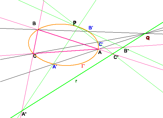 resulta la alineación de los puntos A*=BC’∩PA’, Q=AA’∩CC’ y