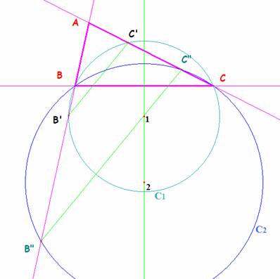 intersecten els costats AB, AC en els punts B’ C’ (la circumferència C1) i en els punts B’’ C’’ (la circumferència