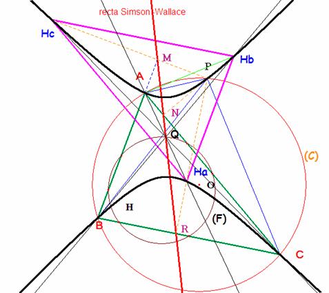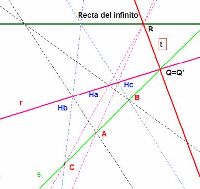 c) Veamos la proposición recíproca. Las rectas AHa, BHb y CHa son concurrentes en Q y el punto P no está sobre ninguna altura del triángulo. Los ejes de las dos proyectividades anteriores definidas sobre G por (P A B)à (C Hb Ha) y (P A C) à (B Hc Ha) van a resolver la cuestión.