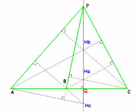 1.- Si el punto P está sobre el lado BC, Hb y Hc han de estar situados sobre la altura desde A del triángulo. Por otra parte, en el triángulo degenerado PBC sus alturas (perpendiculares al segmento por cada punto) son tres rectas paralelas a la altura desde A. El ortocentro Ha es el punto del infinito de esta altura y así resultan Ha, Hb y Hc alineados.