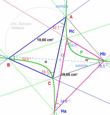 Por los puntos P, A, B, C y Ha, pasa una única cónica G. Como Ha es ortocentro del triángulo PBC, según probamos en el problema nº 341 resulta que esta cónica es una hipérbola equilátera, que igualmente ha de contener a los otros ortocentros Hb y Hc. Podemos pues afirmar que hay una hipérbola equilátera que contiene al triángulo inicial y su ortocentro H, al triángulo de los ortocentros HaHbHc, así como al propio punto P que sirve para definir a éste último.