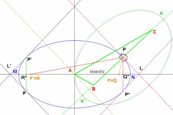 Esta propiedad es la que vamos a usar para demostrar que las dos elipses tienen ejes principales de igual longitud. También sirve para construir los puntos M y N. Considerando los puntos simétricos L’ y R* que también están separados armónicamente por M y N tenemos sobre la bisectriz interior de A una involución en la que son homólogos (L, Q*) y (L’, R*). La involución queda definida conociendo un par de homólogos y sus puntos dobles (si los hay) son los puntos buscados.