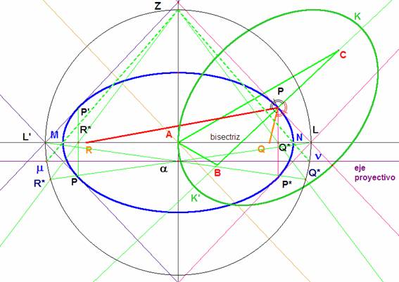 La elipse que buscamos pasa por P y por sus simétricos respecto de los ejes (rectas normal y tangente en A), los puntos P’, P” y P*. Nos falta un quinto punto para fijarla, pero tenemos la tangente en P. Por simetría, si PL es la tangente en P, P*L lo es en P*. La polar del punto L respecto de la elipse es la recta que une P y P*, por ello si llamamos M y N a los puntos de la elipse sobre el eje mayor (donde se encuentra L), la cuaterna formada por los puntos L, Q*, N y M es armónica.
