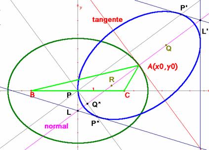 Es fácil hacer el dibujo de la elipse determinada por el triángulo. La bisectriz exterior de A es la tangente en A, la interior es la normal.