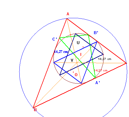 Hay dos homotecias de centros U y V respectivamente, que transforman una circunferencia en la otra, por tanto habrá dos triángulos semejantes al primero con igual perímetro que el órtico.