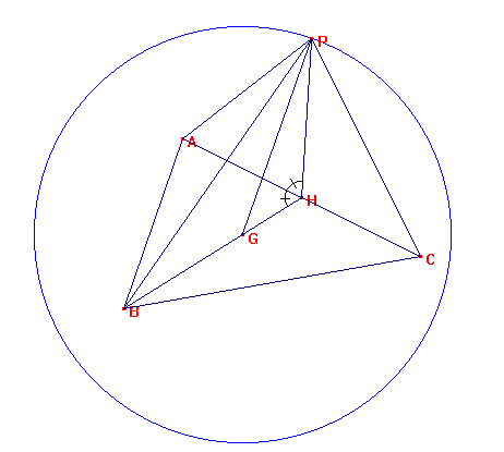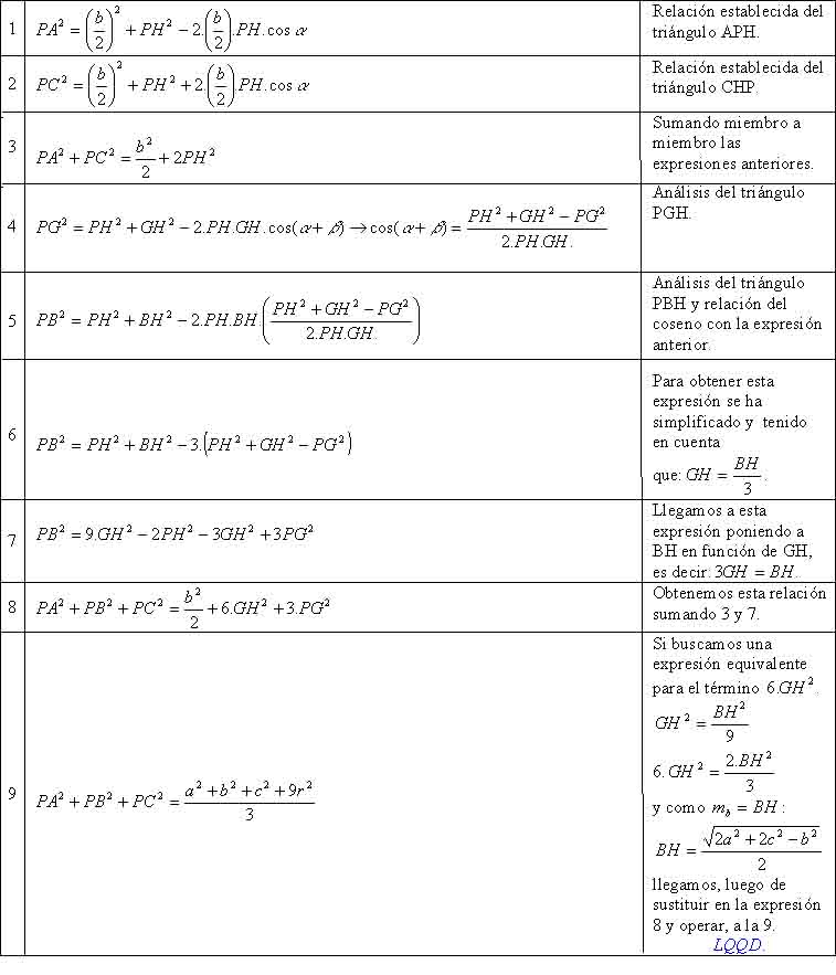 Sea P un punto en la circunferencia tiene como centro el punto G y como radio una longitud cualquiera Demostrar que: PA2 + PB2+ PC2es constante. Retali V, Biggiogero, G. (1936, 1979) "La geometria del triangolo " en "Enciclopedia delle matematiche elementari e complementari" Berzolari,Vivanti and Gigli , editores) Vol II , pp 175. El director agradece a Jeff Brooks y Marcello Brozolo del foro Hyacinthos, la referencia bibliográfica completa.