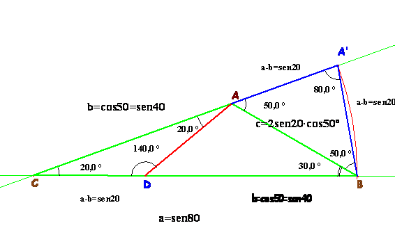 Construimos el triángulo isósceles CBA’ tomando como ángulo desigual el de 20º y lados iguales a a=CB. Un cómputo elemental de los ángulos nos conduce a que el triángulo AA’B es isósceles y con lados iguales (A’A=A’B) a a-b. El lado desigual es c=AB, que puede expresarse en función de a-b. Se tiene c=2·(a-b)·cos 50º.