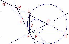 En el triángulo escaleno ABC, con <BAC=90o, se consideran las circunferencias inscrita y circunscrita. La recta tangente en A a la circunferencia circunscrita corta a la recta BC en M. Sean S y R los puntos de tangencia de la circunferencia inscrita con los catetos AC y AB, respectivamente. La recta RS corta a la recta BC en N. Las rectas AM y SR se cortan en U. Demuestre que el triángulo UMN es isósceles.