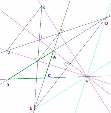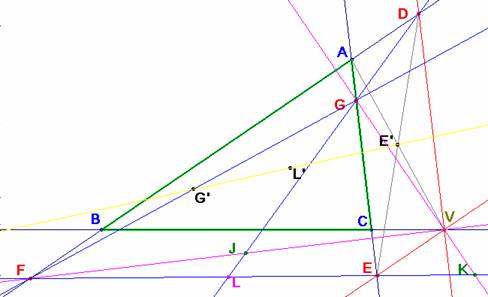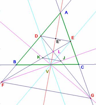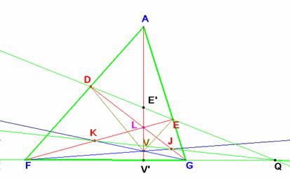 Por ser E’ el punto medio de DE se tiene: (QV’GF)= –1= (QE’ED), Q está en el infinito y V’=G’ es el punto medio de FG. En resumen, AV es la mediana de AFG, y también de LFG, por tanto, las proyecciones de la base por V forman el segmento JK paralelo a ésta. Y también concurre en Q.