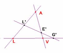 Si DE||FG , la recta AE’ = AV es mediana de los triángulos ADE y AFG. Tomando L= FE∩GD resulta que L está sobre la mediana AV de AFG y de ADE (propiedad 1).