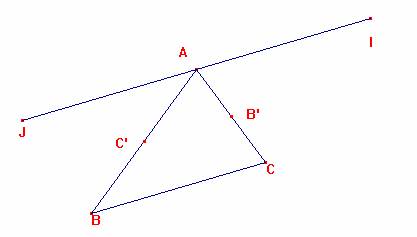 Luego AI = 2C’B’, y JA=2C’B’. Luego ambos AI y AJ son paralelos a C’B’ y miden igual. Así A es punto medio de JI. Cqd.