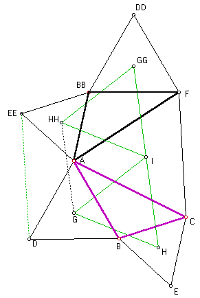 Por Dr. Scott Brodie, Dr.Sea ABC el triángulo original. Sean D, E y F en el exterior tal que ADB, BEC y AFC sean equiláteros, cuyos baricentros sean G, H e I. Demostremos que <HIG=60º. Tomemos I como centro de giro, y rotemos la figura entera 120º, superponiéndose sobre la figura original. Según el giro, A->F, F->C y C->A, I->I, B->BB, D->DD, E->EE, G->GG, y H->HH, respectivamente. Unamos D a EE y G a HH. Por la rigidez del giro, ΔG H I = Δ GG HH I. En particular, G H = GG HH. Consideremos ahora los seis triángulos que comparten el vértice A. Tres de ellos son equiláteros (ABD, ACF, y A EE BB). <BB A F=<BCA, <D A EE =<ABC y el pentágono A BB EE D B es congruente con el pentágono BECAD. Por ello, G HH = GH, y G HH = GH = GG HH. |