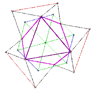 Repitiendo el giro 120º y uniendo otros equiláteros, se obtiene la figura de la derecha. Arguyendo como anteriormente, el hexágono central es equilátero, y los seis triángulos que están alrededor del centro de rotación son congruentes. Entonces, 6 * <HIG=360º, y <HIG=60º. Dado que el centro de rotación I ha sido arbitrario, HIG es equiangular, y por tanto, equilátero, cqd. |