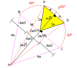Trazamos la altura AH que corta al arco PQ en T También observamos que PQ//BC y como los arcos miden 60º entonces el triángulo PHQ es equilátero Ahora sea la semicircunferencia de radio R=2.a entonces el